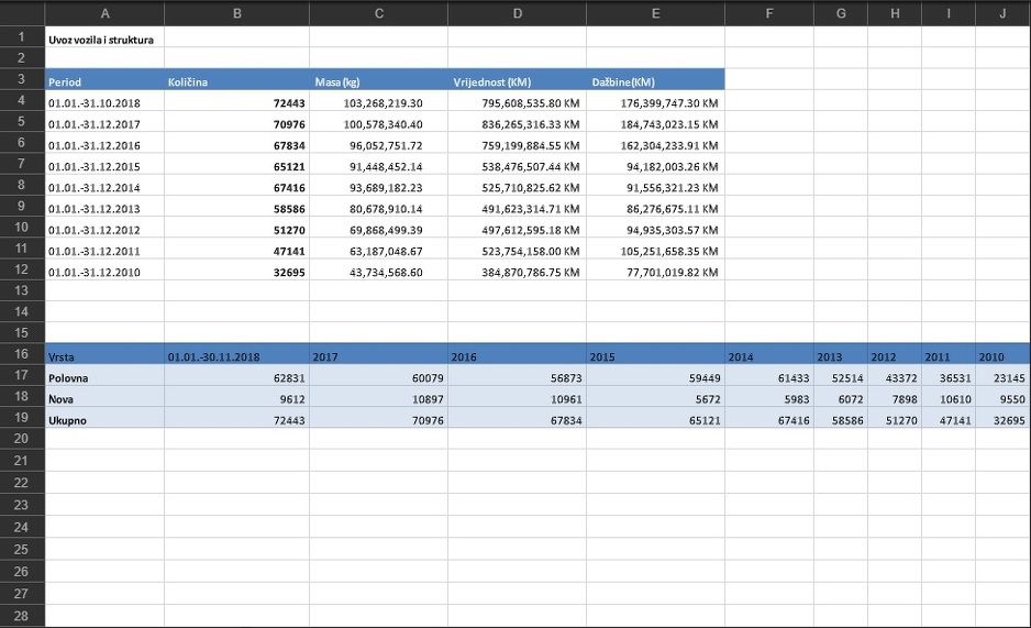 U BiH se, prema podacima koje smo dobili iz Uprave za indirektno oporezivanje, iz godine u godinu uvozi sve veći broj automobila, ali je 2018. godine, u odnosu na 2016. i 2017. godinu, smanjen broj uvezenih novih vozila.