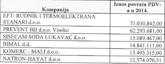 Zanimljivo je da firme koje su pod državnom palicom poput „Aluminijuma“ Mostar, te „Alumine“ Zvornik kćerka firme Fabrike glinice Birač, kao i privatne kompanije „ArcelorMittal“ Zenica i „Euro-Asfalt“ Sarajevo nisu dale odobrenje UIO da objavi koliko im je isplaćeno po osnovu povrata PDV-a.