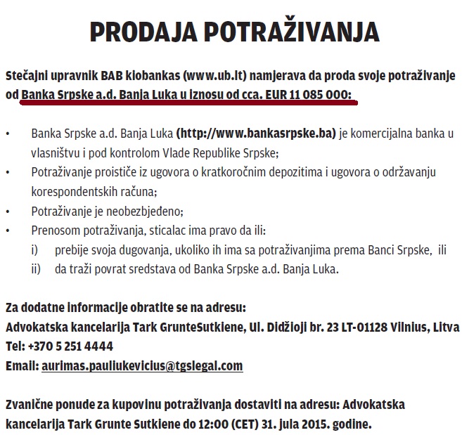 „Prenosom potraživanja, sticalac ima prava da prebije svoja dugovanja ukoliko ih ima sa potraživanjima Banke Srpske ili da traži povrat sredstava od Banke Srpske“, navodi se u oglasu.