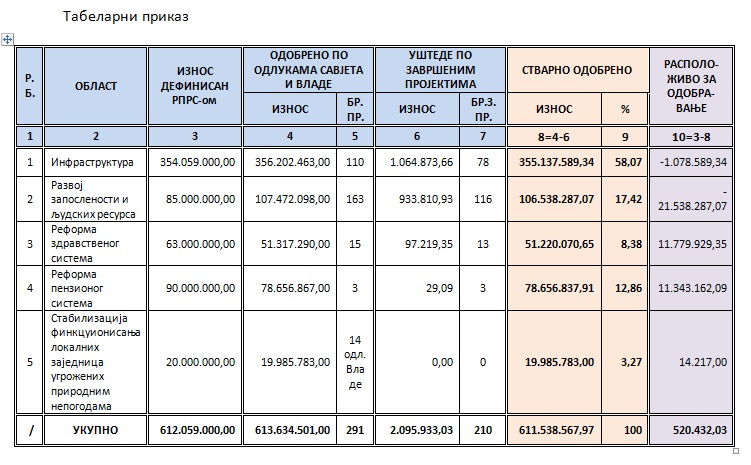 „Ukupno odobrena sredstva ESK RPRS prema odlukama Savjeta za razvoj i Vlade zaključno sa 31.07.2014. godine iznose 613.634.501 KM. Savjet za razvoj na 29 održanih sjednica donio je odluke o finansiranju 291 projekta za koje je iz ESK RPRS odobreno 593.648.718 KM (a doneseno je i 100 odluka o izmjeni ranije donesenih odluka), a Vlada Republike Srpske 14 odluka (sve donesene u 2010. godini) za dodjelu sredstava za stabilizaciju funkcionisanja lokalnih zajednica ugroženih prirodnim nepogodama u vrijednosti od 19.985.783 KM (i to 12.500.000 KM opštinama u Republici Srpskoj – 16 opština za saniranje šteta od poplava i 7.485.783 KM Republičkoj direkciji za robne rezerve za proljetnu sjetvu).
