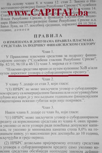 Vlada Republike Srpske je tri dana pred opšte izbore u BiH (09.oktobra), usvojila izmjene i dopune “Pravila plasmana sredstava za podršku finansijskom sektoru” kojima se, po prvi put, omogućava IRB-u da komercijalnim bankama i osiguravajućim kućama sada, uz kupovinu njihovih hartija od vrijednosti može pomoći i „putem direktnog ugovora o subordiniranom kreditu“.
