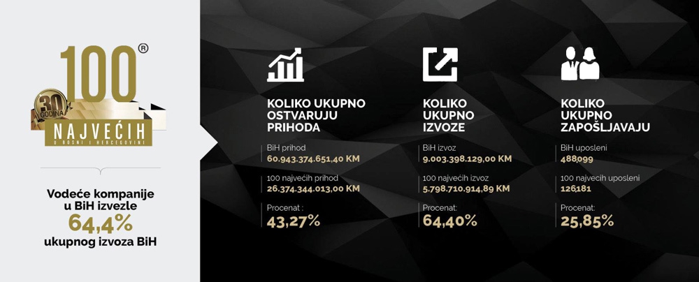 Kako je pokazalo istraživanje Poslovnih novina, ove 743 kompanije izvezle su 64,4% od ukupnog izvoza BiH u 2016. godini. To ih svrstava među glavne nosioce razvoja naše zemlje čiji ukupni izvoz je iznosio skoro 5,8 milijardi KM, dok je cjelokupni lanjski izvoz privrede BiH iznosio oko 9 milijardi KM.