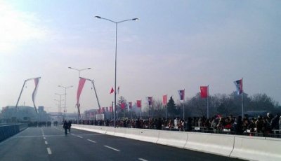 Građani koji su se okupili da prisustvuju ovom istorijskom trenutku nose zastavice Kine i Srbije, a na samom ulazu na most su dva krana sa velikim zastavama dvije države.