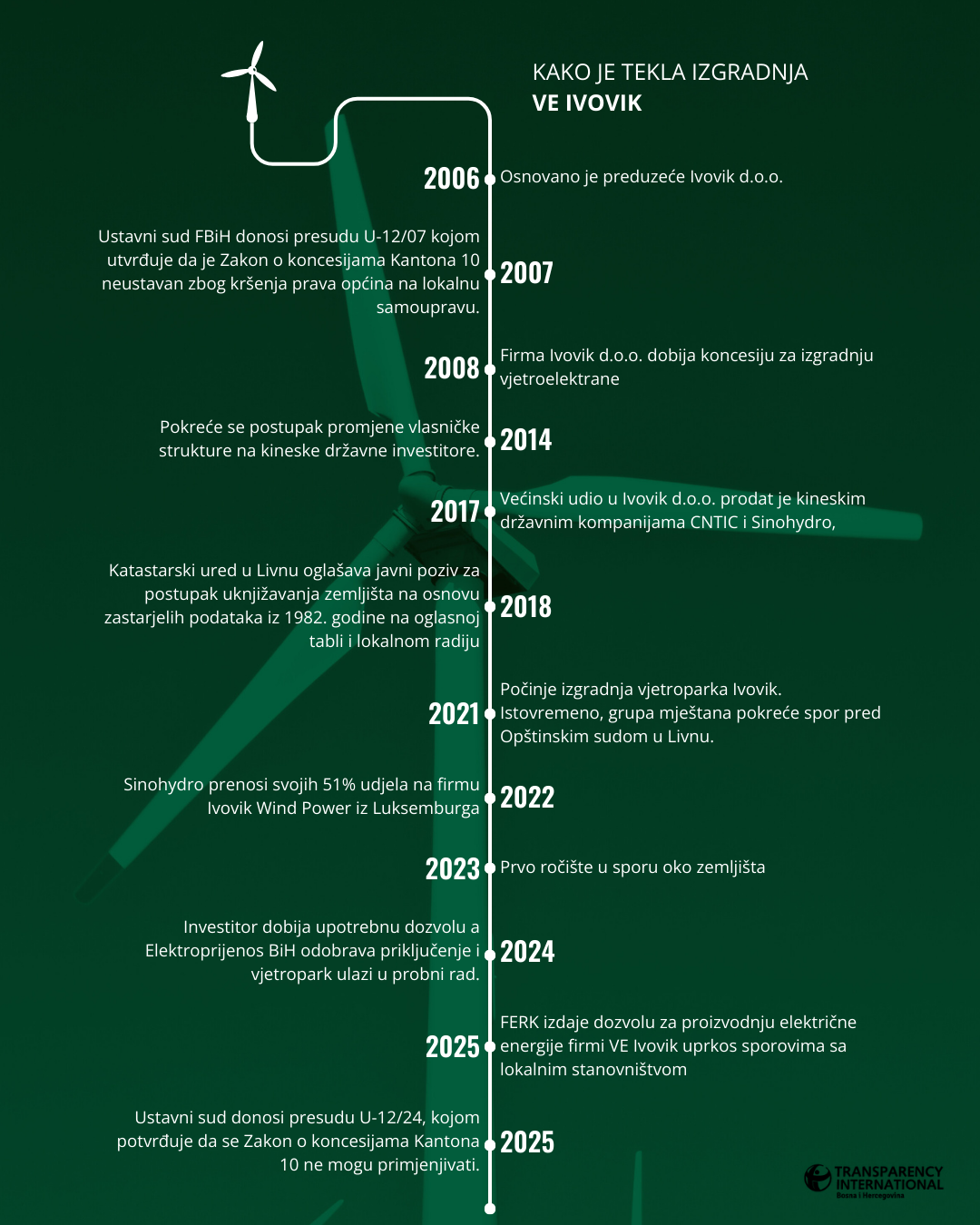 Problemi oko izgradnje vjetroelektrane, koje je TI BiH detaljnije izložio u najnovijoj studiji slučaja, se protežu od 2008. godine, kada je Vlada kantona 10 prvobitno dodijelila koncesiju firmi Ivovik d.o.o. čiji vlasnik, pokojni Ivan Matković je bio brat Stjepana Matkovića, tadašnjeg ministra poljoprivrede, vodoprivrede i šumarstva u kantonalnoj vladi. Osim ovog potencijalnog sukoba interesa, proces dodjele koncesije za ovaj projekat je sproveden uprkos odluci Ustavnog suda Federacije BiH da je Zakon o koncesijama Kantona 10 povrijedio pravo na lokalnu samoupravu te se ne smije primjenjivati, što je ovaj sud ponovio u odluci iz 2024. godine.